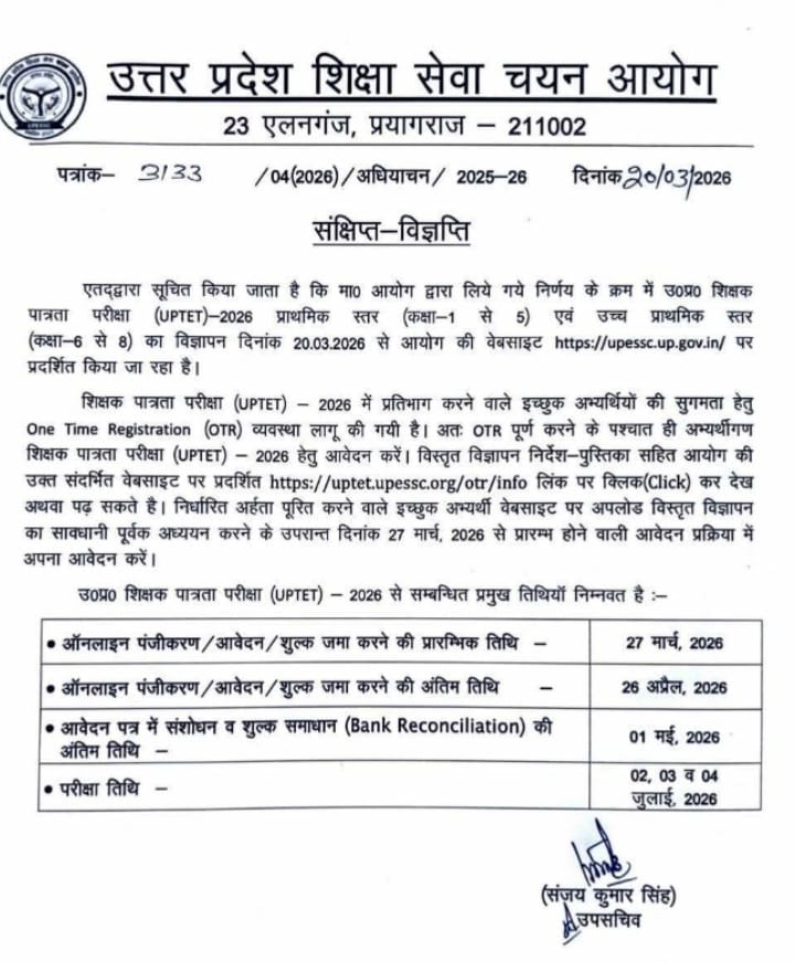 UPTET 2026 Notification जारी! परीक्षा तिथि, पात्रता, सिलेबस, फीस और आवेदन की पूरी गाइड (PDF डाउनलोड लिंक सहित)